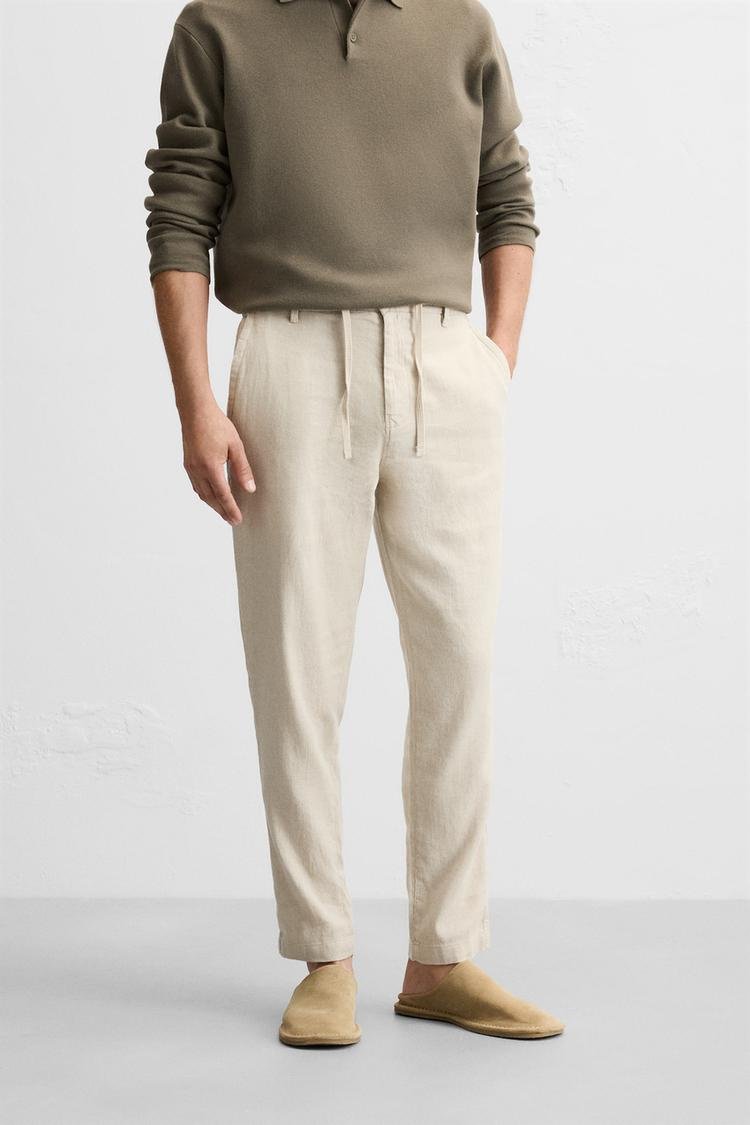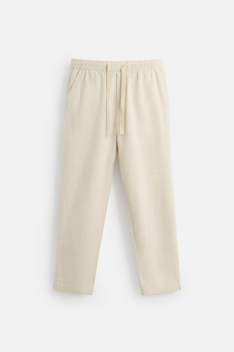 Slim fit trousers made of cotton and linen blend fabric. Elasticated waistband with adjustable drawstring. Front pockets and back welt pockets. Front zip fly and button fastening. Summer friendly Uora, LINEN/COTTONÂ TROUSERS.