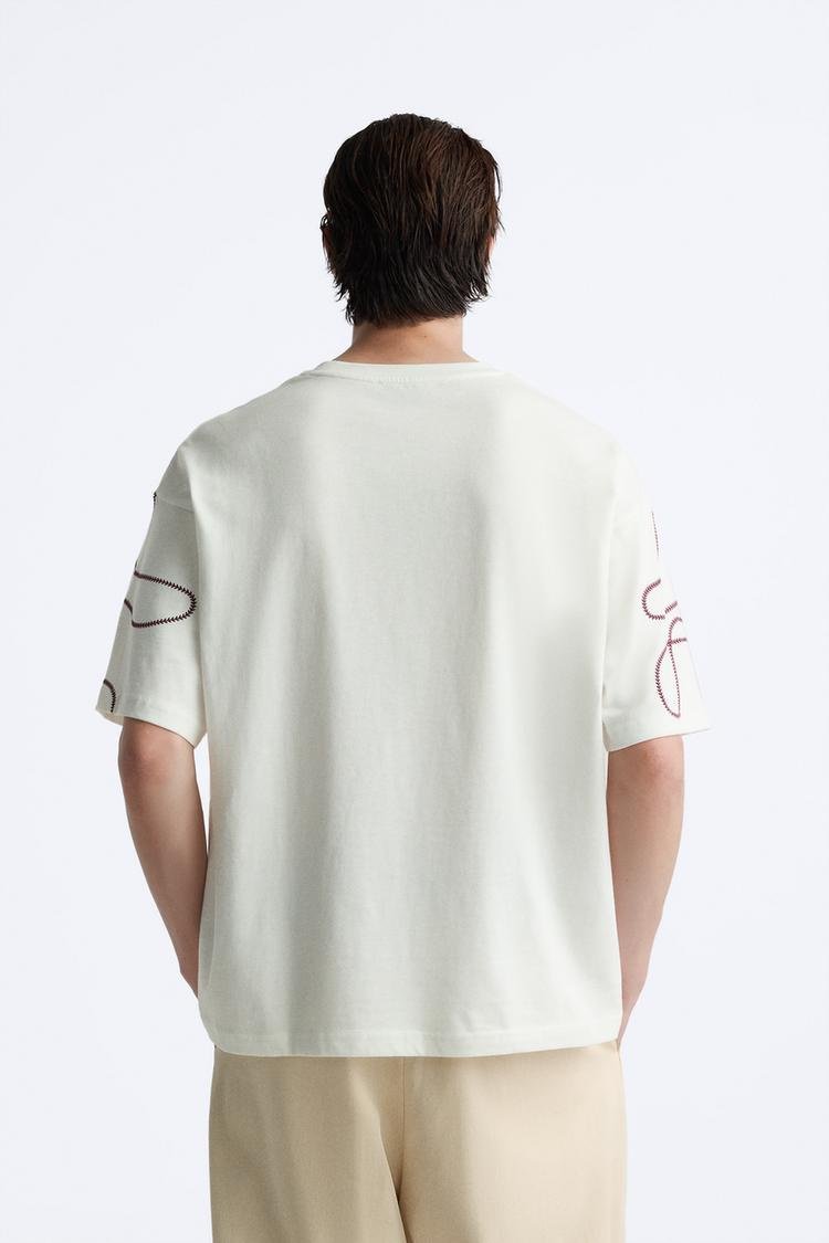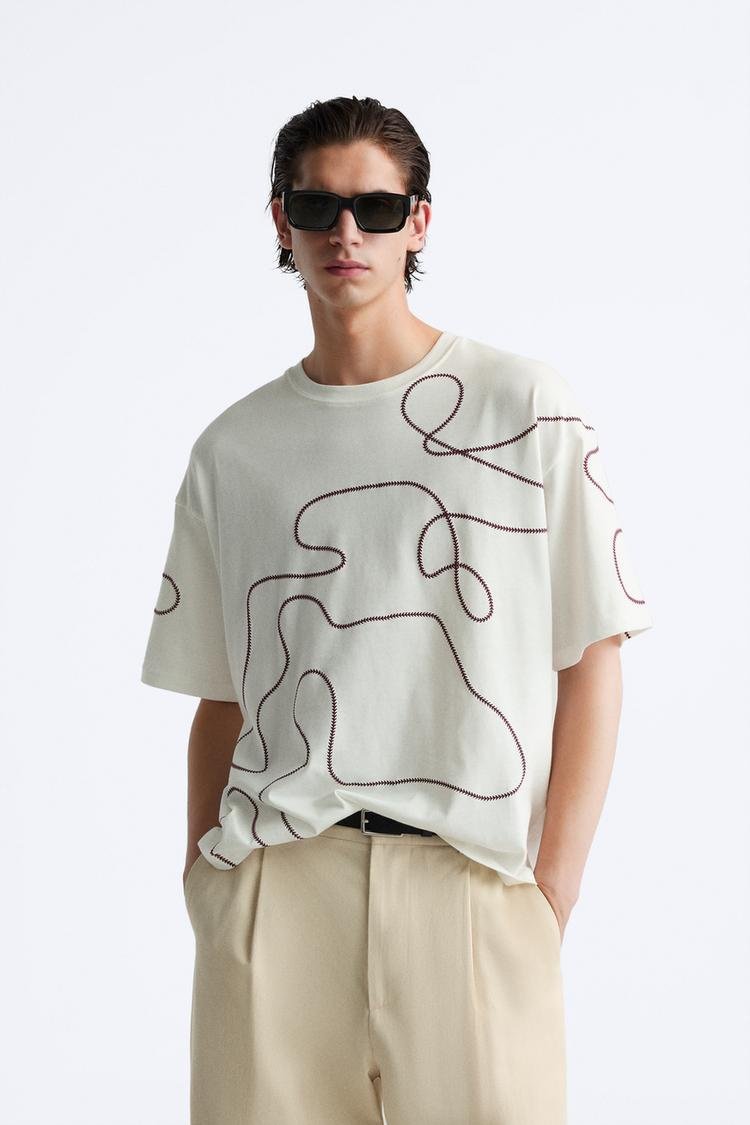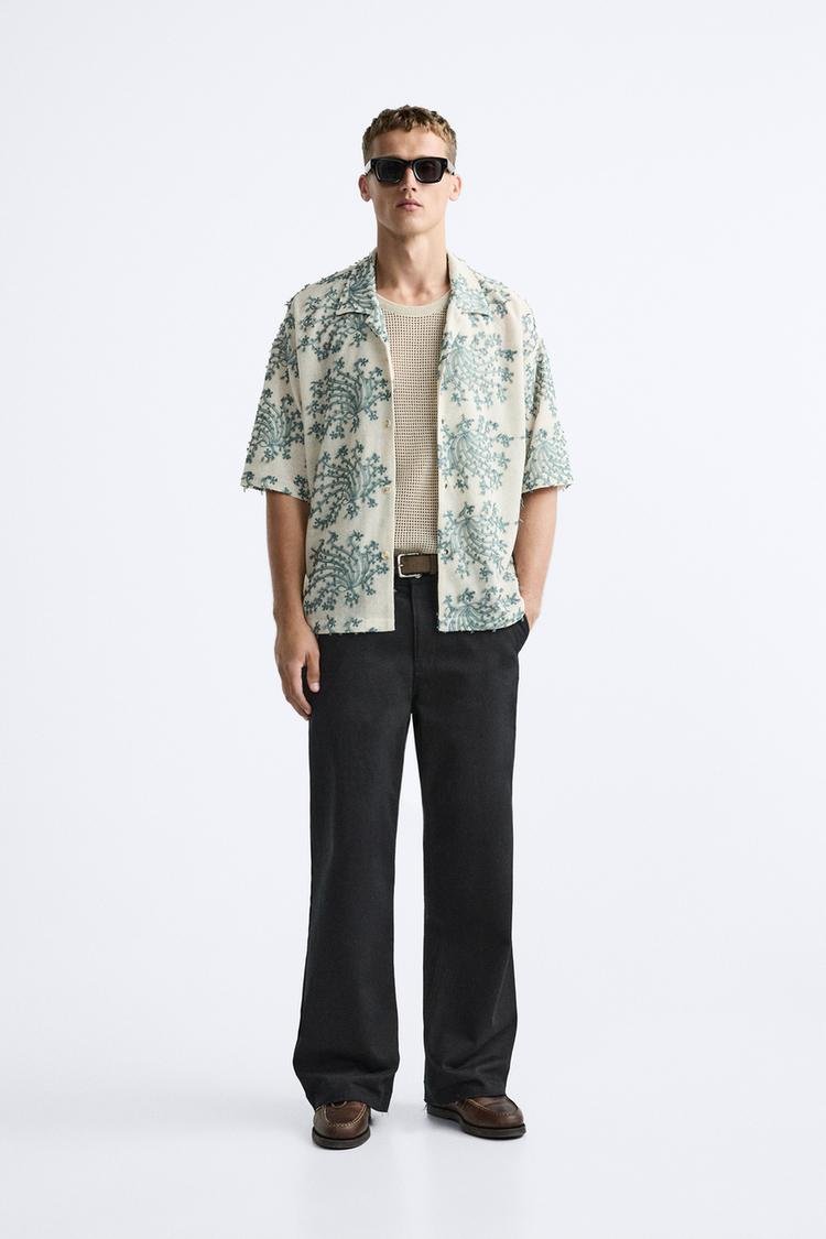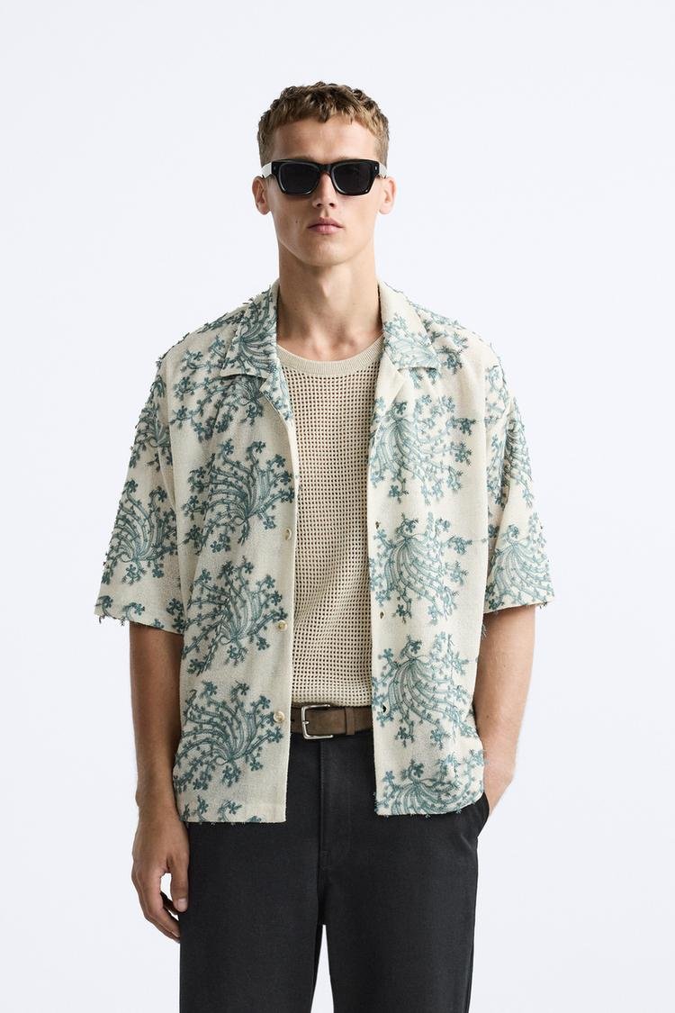Uora, Relaxed fit shirt. Camp collar and short sleeves. Contrast embroidery all over the garment. Button-up front.