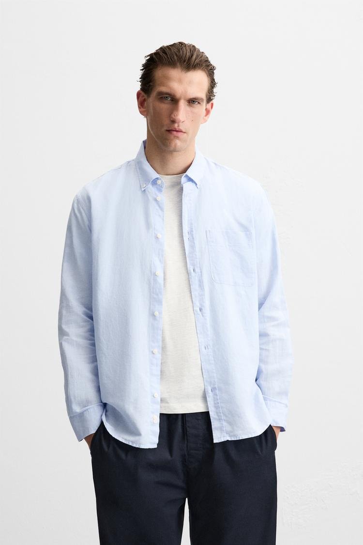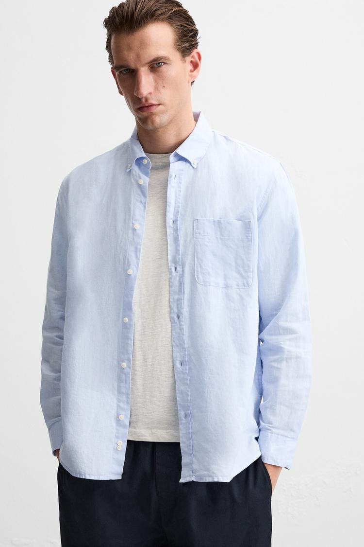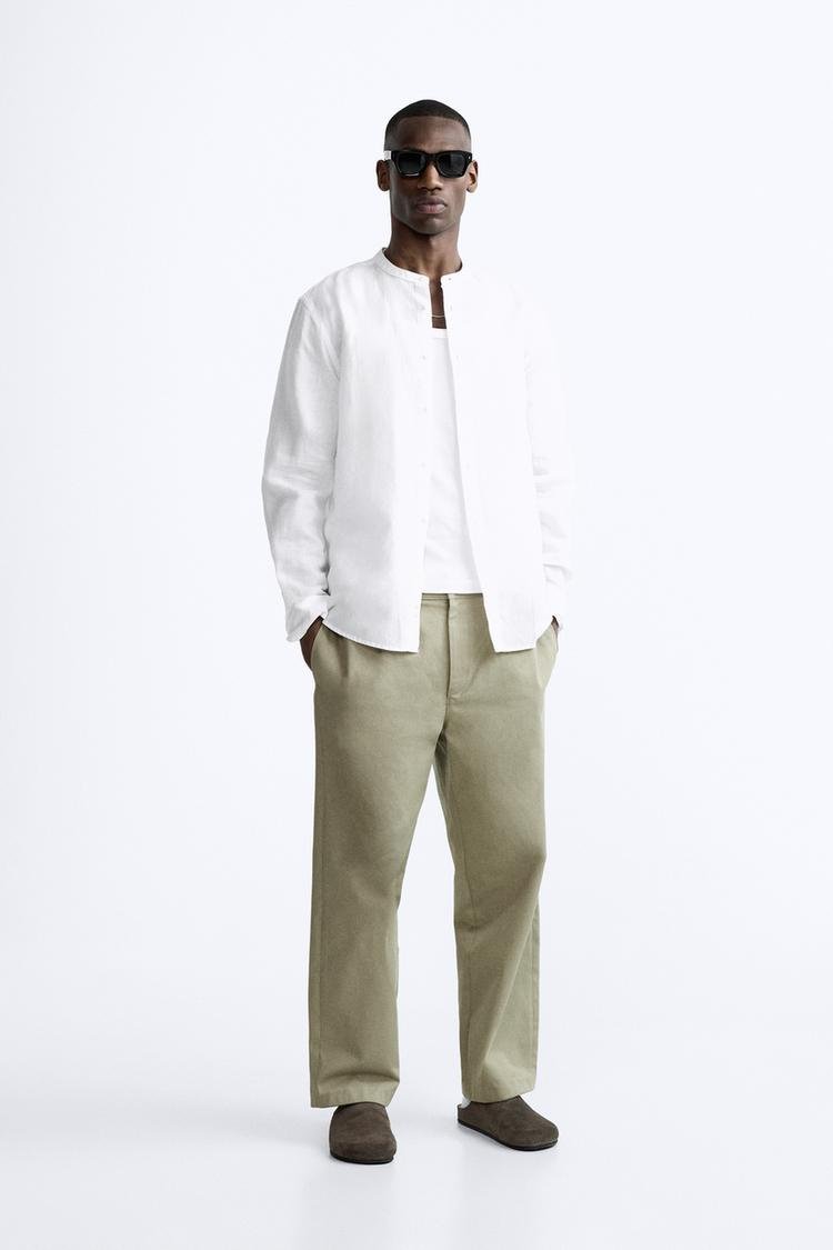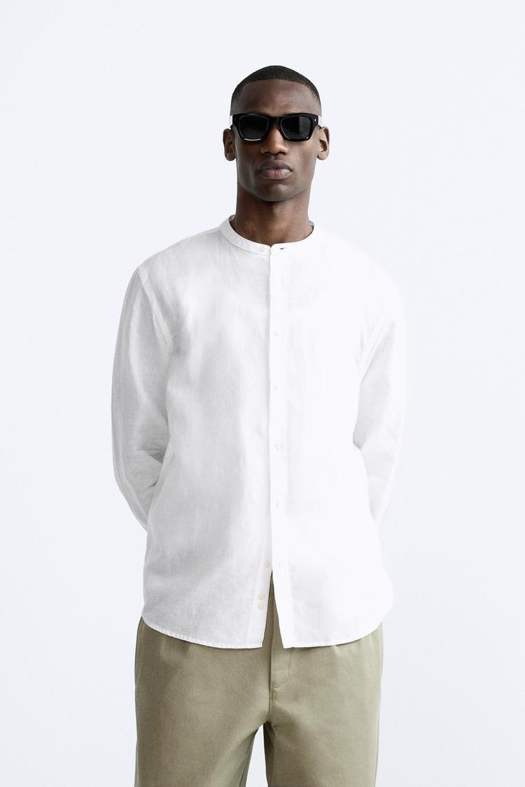 Uora, Relaxed fit shirt made of a linen and cotton blend. Stand-up collar and long sleeves with buttoned cuffs. Button-up front.