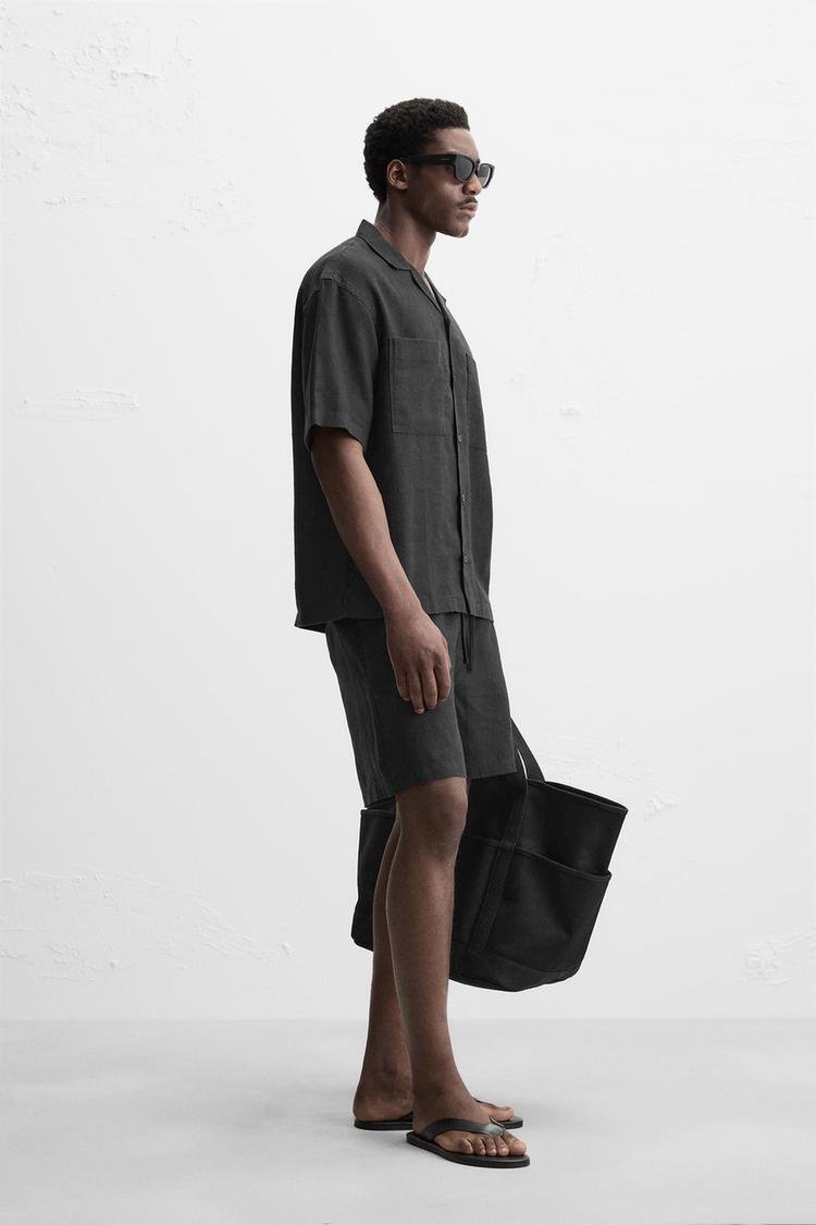 Relaxed fit linen shirt. Camp collar and short sleeves. Patch pockets on the chest. Hem with side vents. Button-up front.